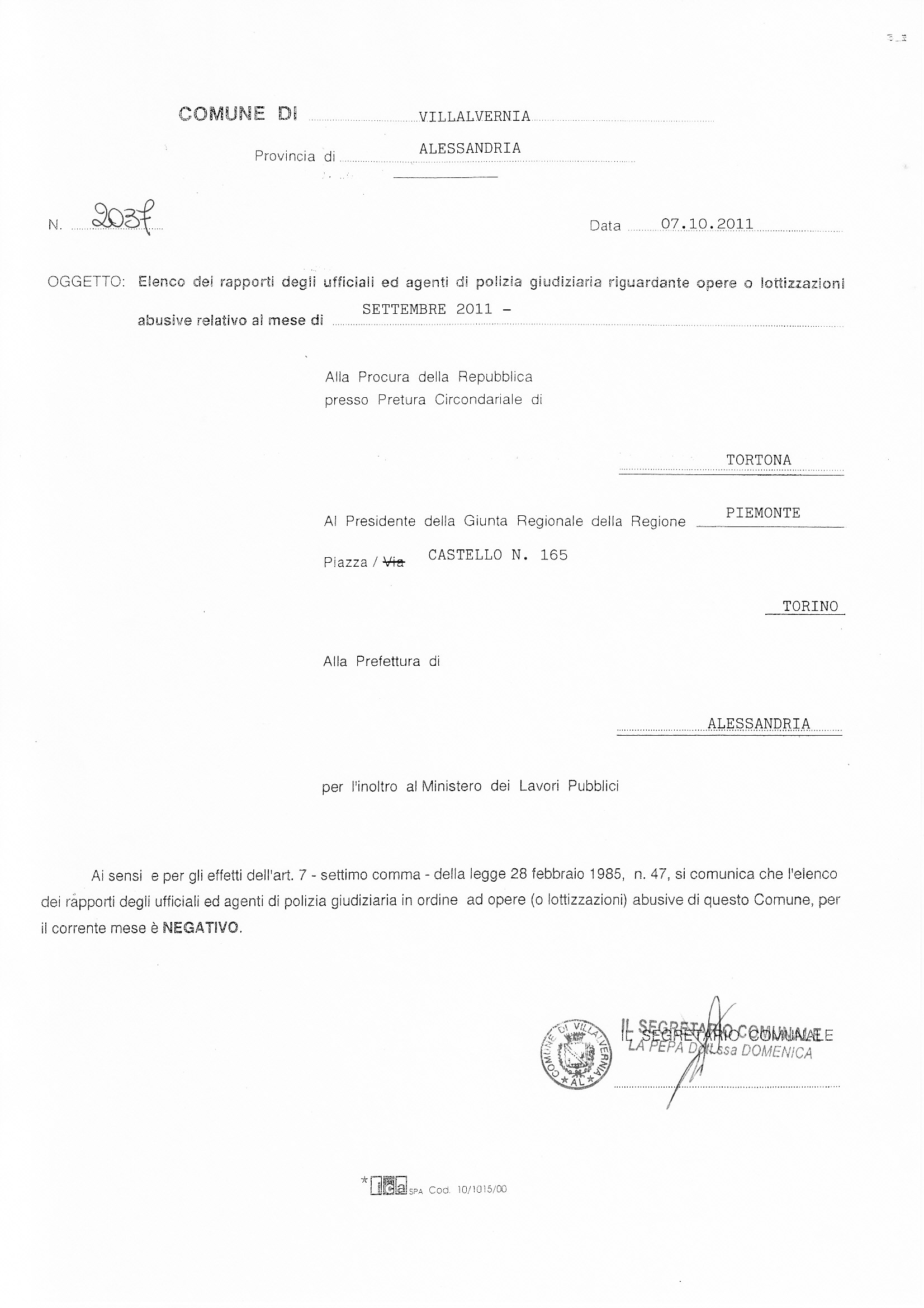 Elenco dei rapporti degli ufficiali ed agenti di polizia giudiziaria riguardante opere o lottizzazioni abusive relativo al mese di SETTEMBRE 2011